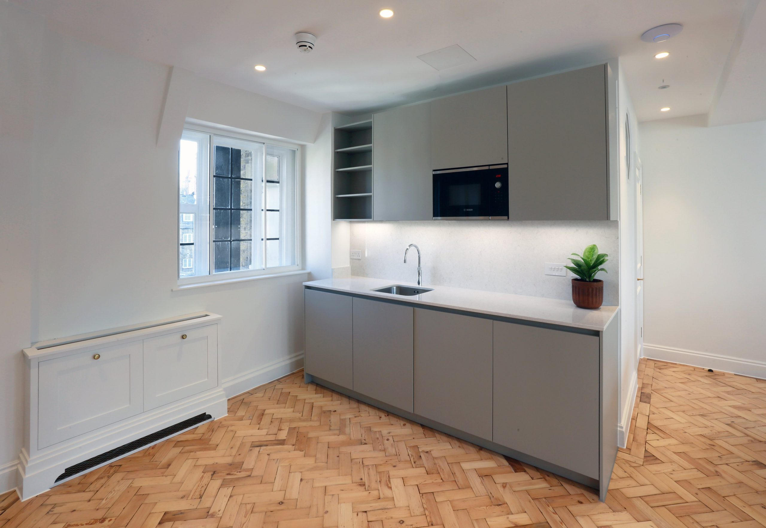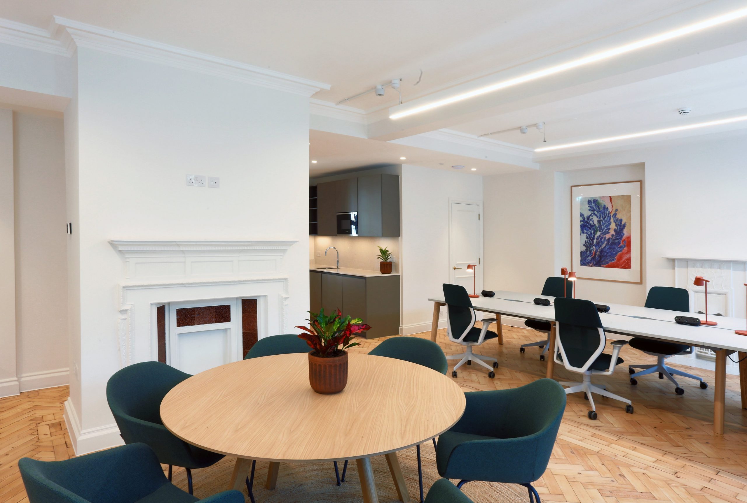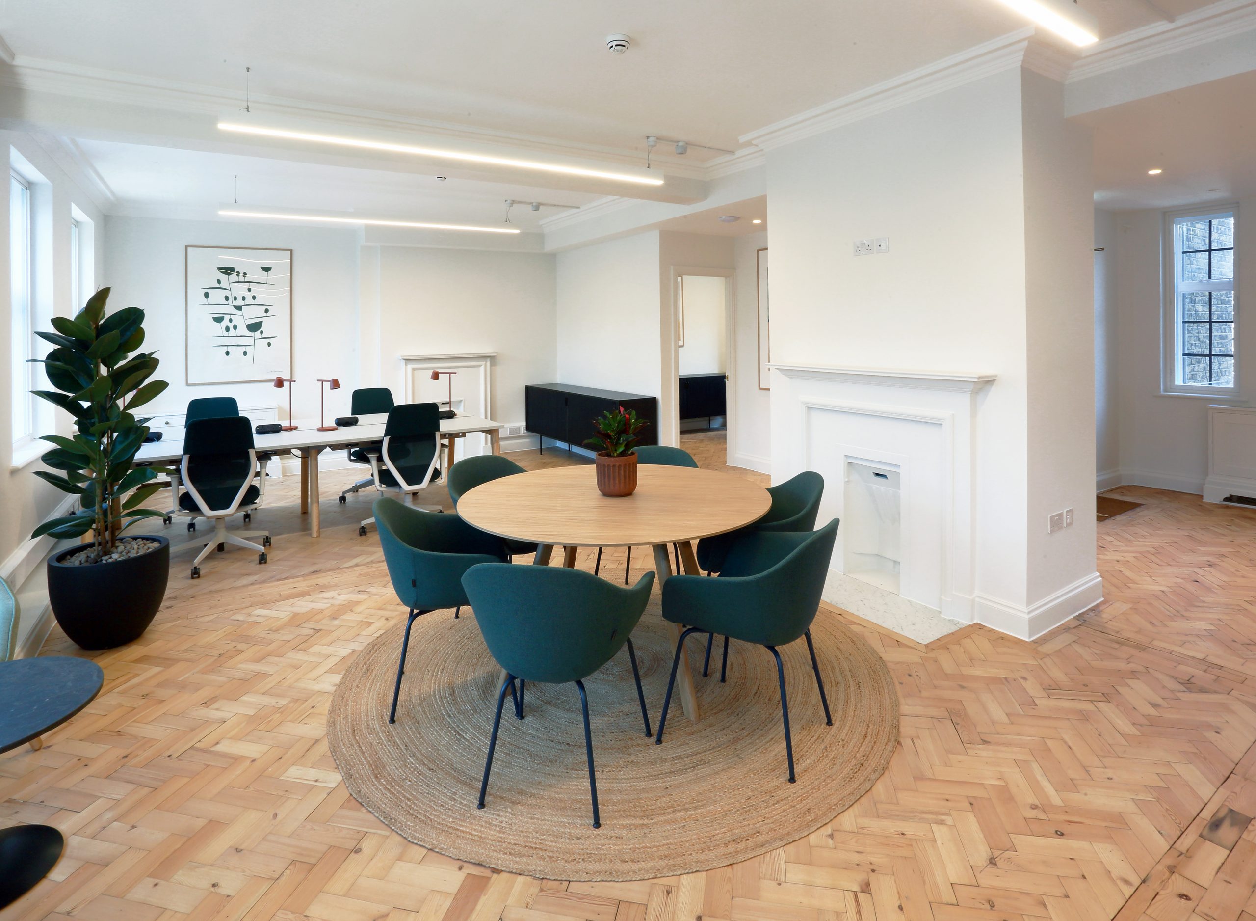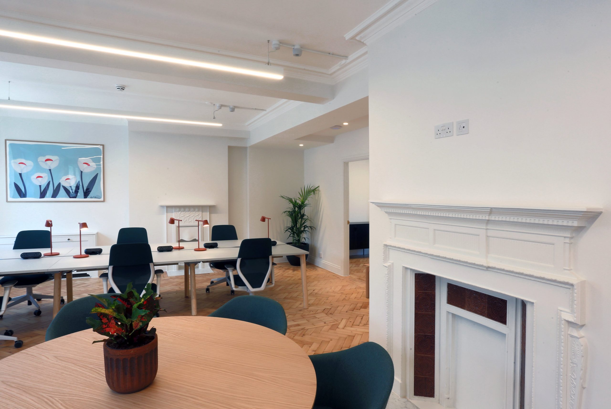 Original features were given new life, such as parquet flooring which was restored following removal of floor coverings installed using asbestos bitumen adhesive, all original chimneypieces were also taken off site for several weeks and restored.