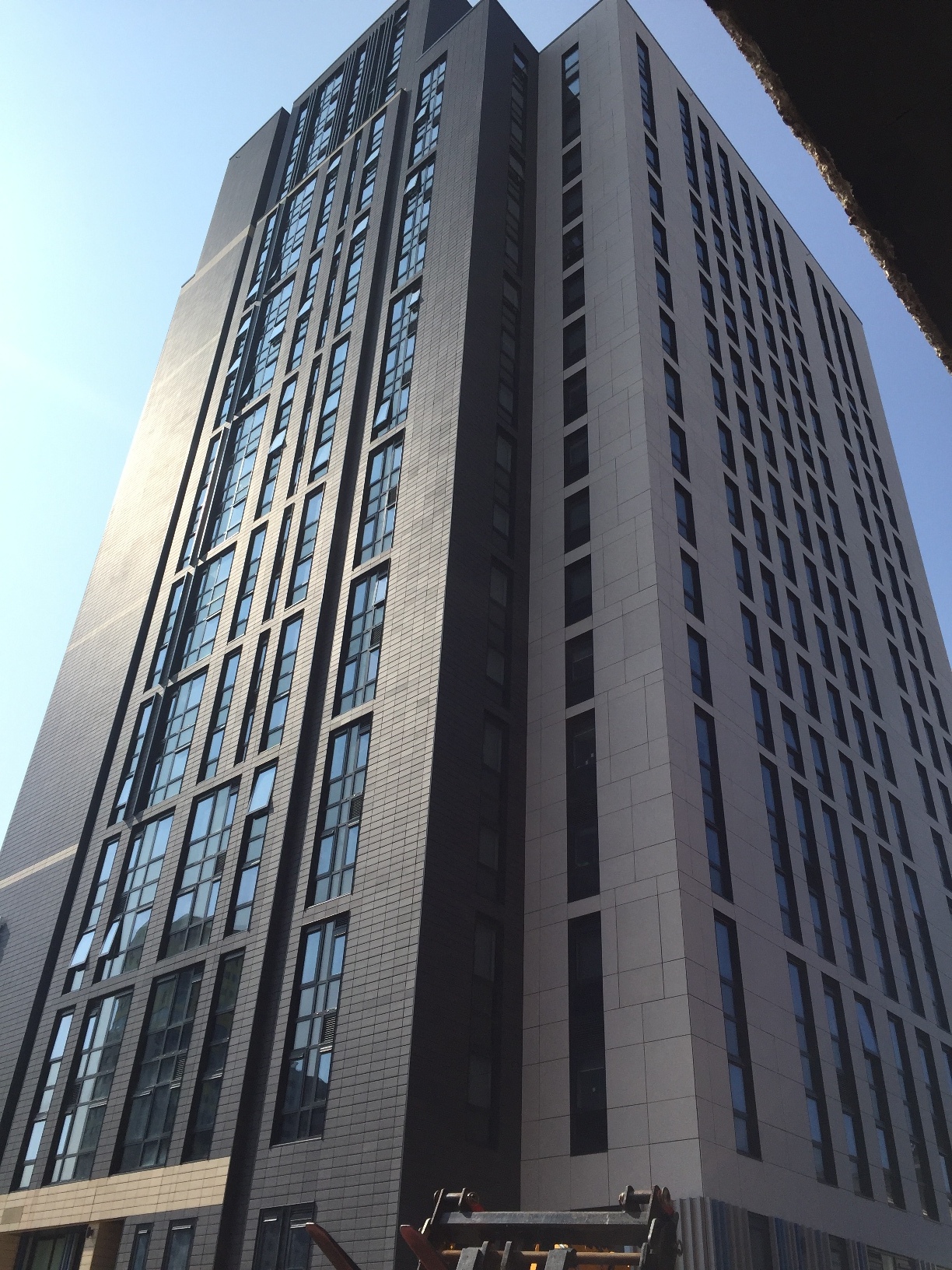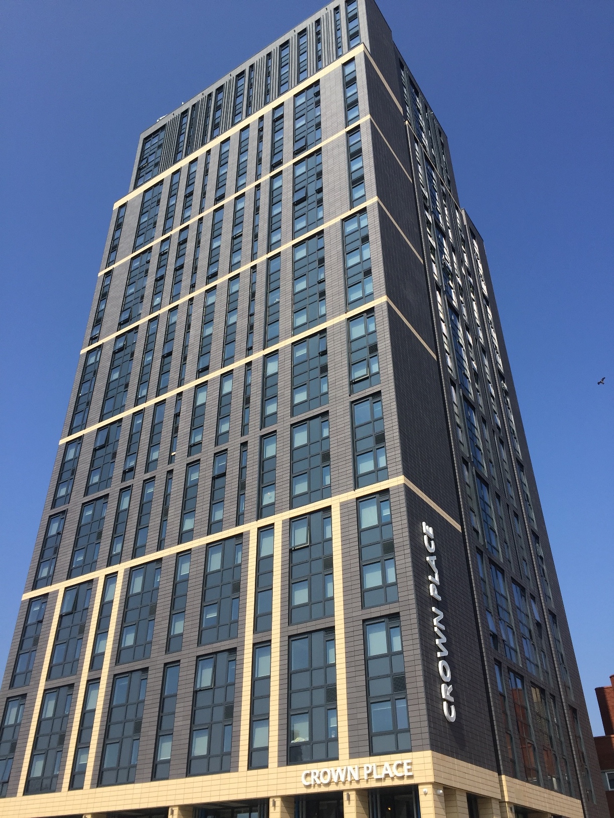 No1 Portsmouth is a new-build, 23-storey tower block in the centre of Portsmouth close to the railway terminal. Built on the site of an old hotel that was hit by a bomb in WWII, this new student accommodation block has 576 rooms and shared amenities for leisure and study.